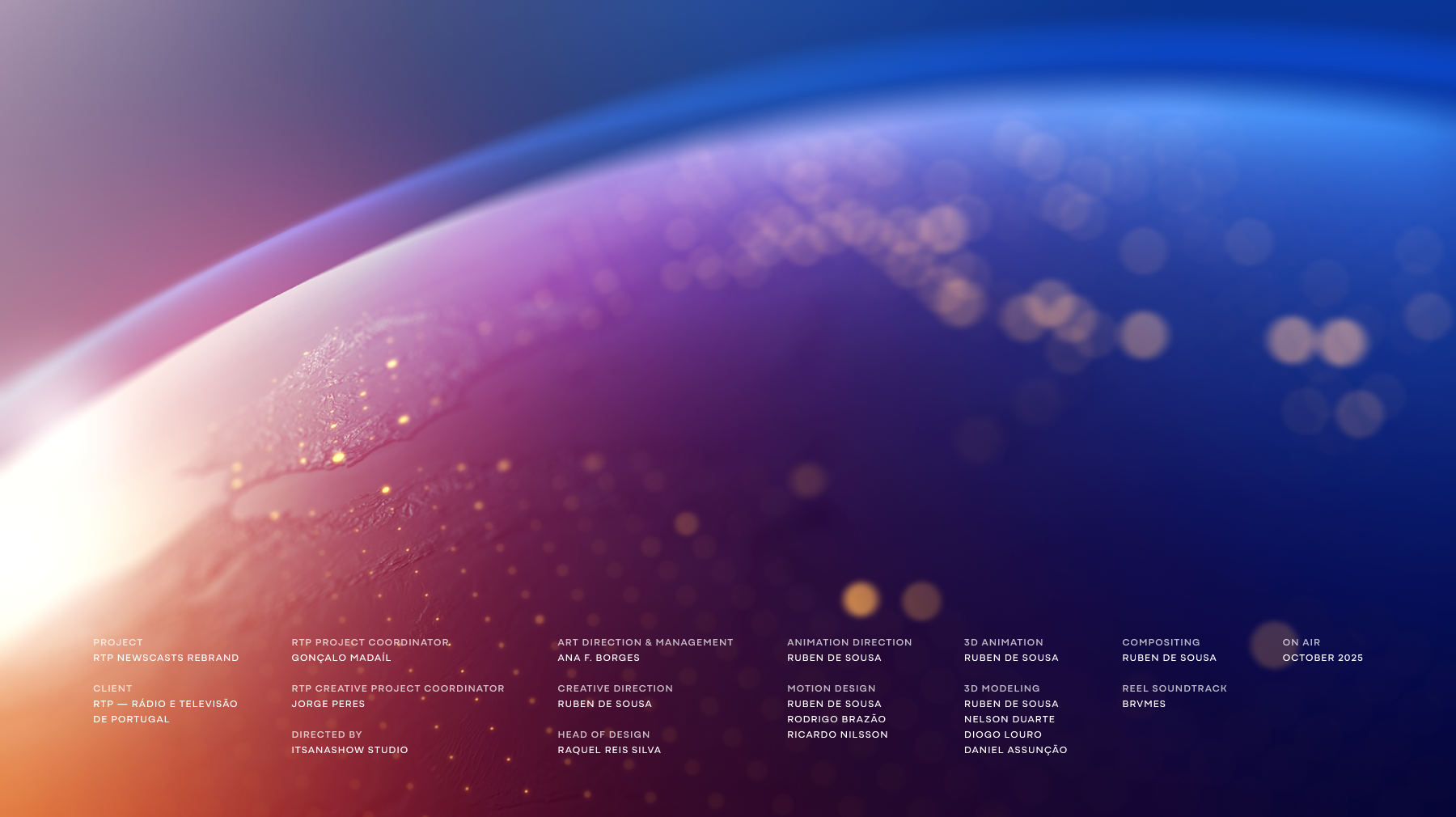 Developed over more than a year in close collaboration with RTP's in-house team, the project touched every layer of the broadcaster's news presence: openers, on-air graphics, channel IDs, break bumpers, and promo systems, across 7 channels and 6 individual program identities. A unified system where brand strategy, motion design, and editorial thinking work as one.